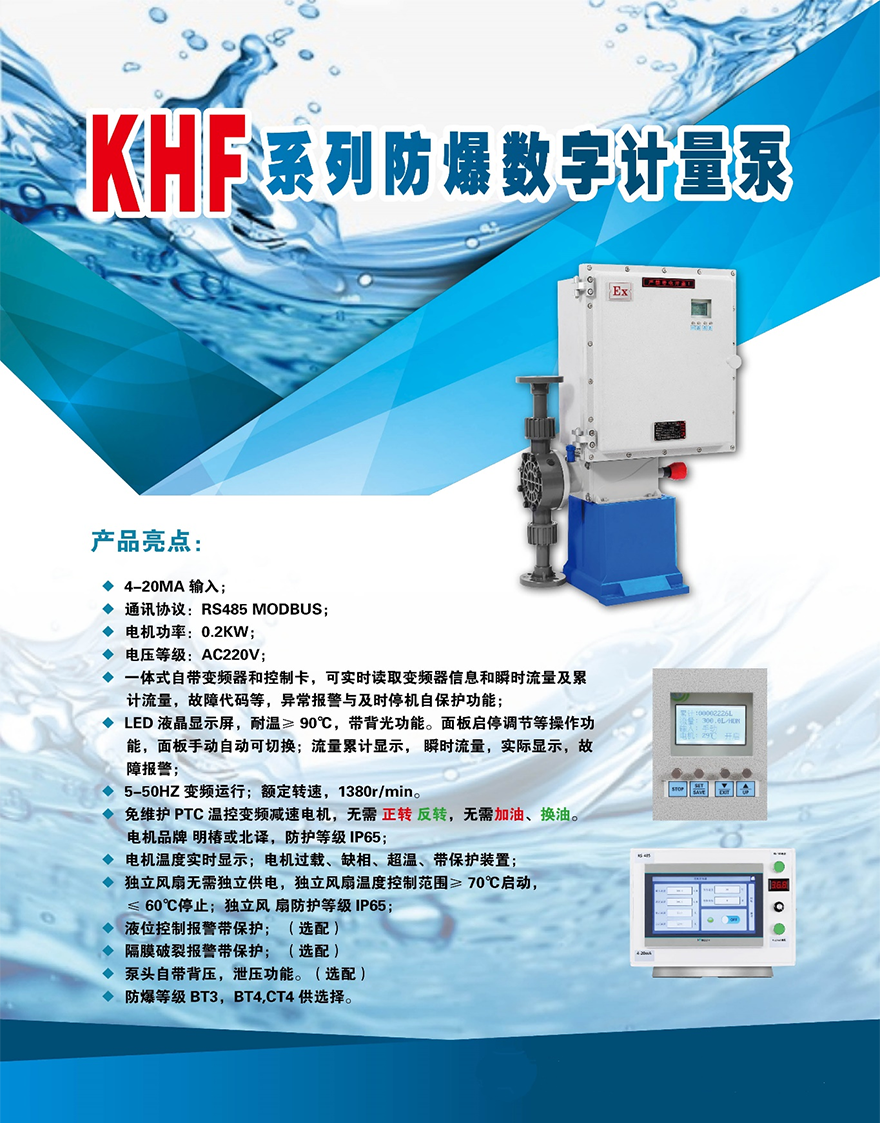 自主研發(fā)的的智能型KHF系列數(shù)字計量泵,為客戶提供化學品精確投加智能化解決方案。數(shù)字計量泵機械結(jié)構(gòu)簡單,安裝維護方便,獨特的驅(qū)動設(shè)計,使得流量控制簡單又精確。泵融合多種智能設(shè)計于一身,結(jié)合流量、液位、壓力、時間等方面予以控制,通過集成的微處理器予以自動化運算和反饋,友好的按鍵式人機界面系統(tǒng)讓操作更便利化。