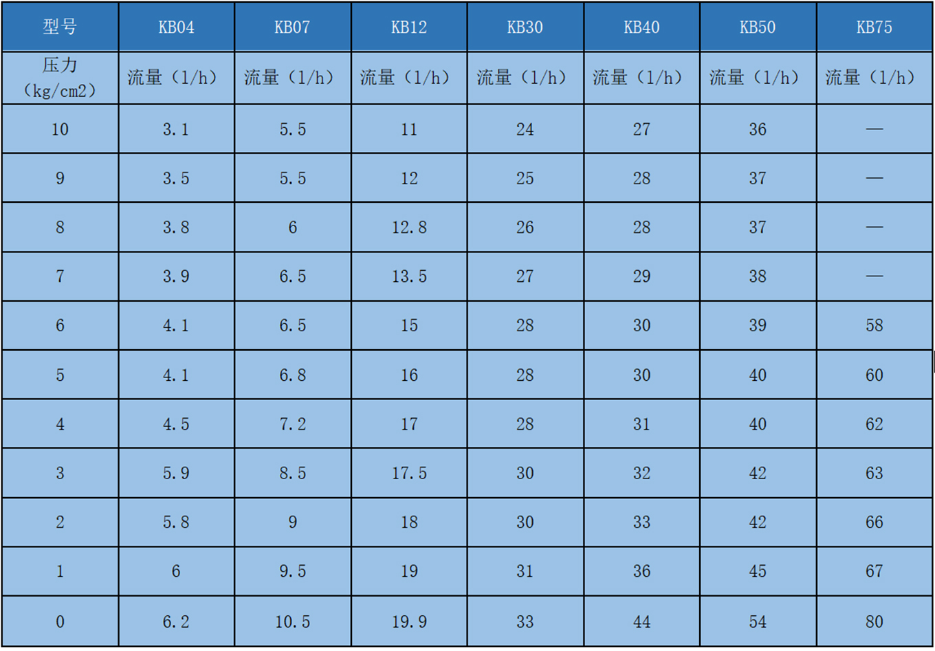 KB系列性能曲線表(清水測(cè)試值)
